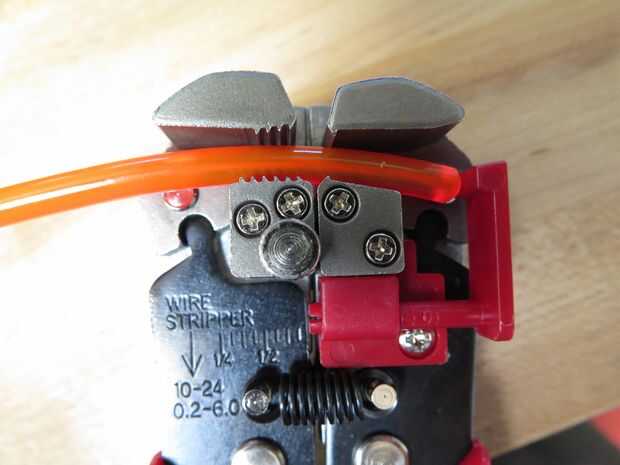 Tomar cada filamento del alambre y la tira de 1" de un extremo con el pelacables automático. Puede ajustar cómo profundamente el stripper corta girando la rueda pequeña en la parte delantera. He encontrado que generalmente debían utilizar el stripper varias veces en el cable de 5mm para conseguir que la tira a través de todo el camino. Su objetivo es exponer el fósforo cubierto alambre de la base, sin romper los dos cables de pelo diminuto a su lado. Podría tomar varios intentos para llegar a esta derecha.