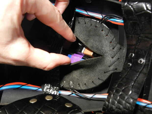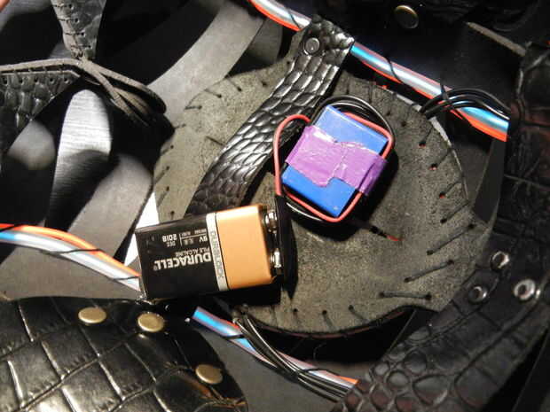 Todo te queda para hacer es conectar el controlador y si lo desea, colocar una bobina de alambre dentro del bolsillo de la batería para que le brillen suavemente. Esta es la 3' sección de alambre de 5mm rojo. Acabo de colocar minas alrededor en sí mismo y pegado con cinta transparente, asegurándose de que hice el lazo pequeño nido suficiente dentro del bolsillo de la batería.
