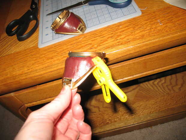 2. Corte el puente elástico. Como se puede ver en la segunda foto, no creo que esto hasta después de que había pintado y pegado en mi piel. Esto hizo mucho más difícil. Hacer esto antes de pintar, usted las gracias a ti mismo más tarde. Puede utilizar cualquier método que desee para librarse de este pequeño pedazo de plástico. Aserrado en él con un cuchillo y plyers para no dañar mi trabajo de pintura. Si usted piensa que usted desea utilizar su elástica otra vez, no necesita molestarse con este paso (aunque todavía podría recomendarlo por si cambias de opinión más tarde, ya?)