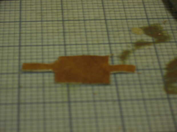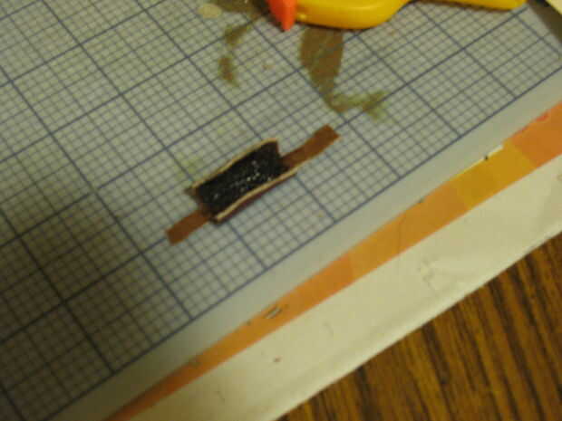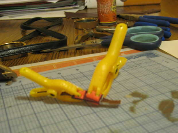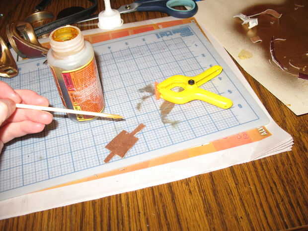 9. puente de la nariz de pegamento. Utilizando su fiel pegamento del gorila, manchan un poco en la parte del rectángulo grande en un fino, incluso la capa. Luego, doblar los lados al centro y fijarlo con la abrazadera hacia abajo. Esto no sólo añade fuerza, pero se asegura de que la tira de cuero se ve acabada en ambos lados.