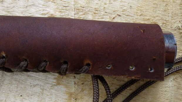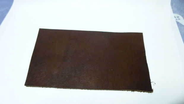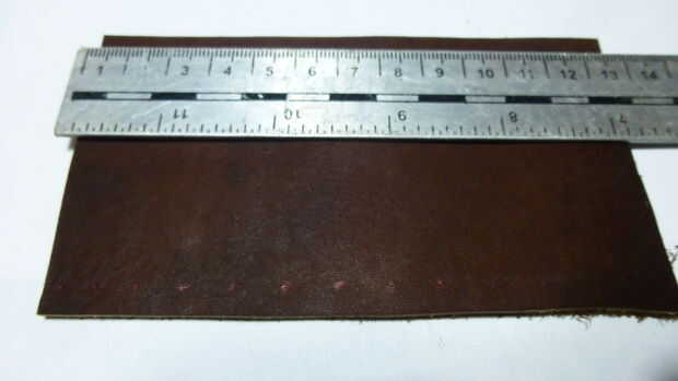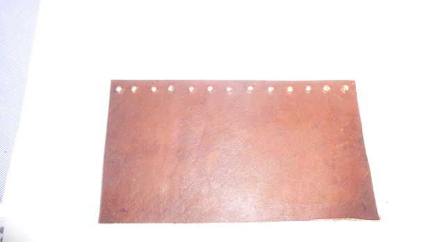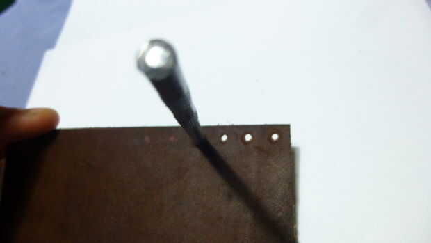 Una vez que las dos piezas de cuero sumergir en agua durante dos horas, luego trace una línea a lo largo de las pieza y marca pequeños puntos cada 5 mm, luego punch 12 en agujeros de cada lado.