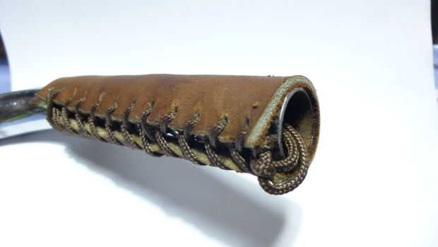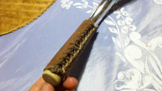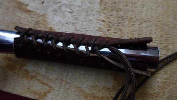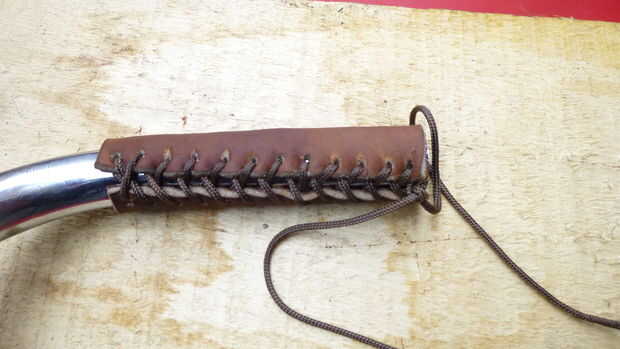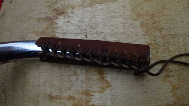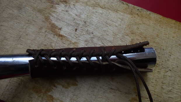 Envolver el tubo de la barra de la manija y empezar a atar fuertemente el puño, finalmente reunir los puntos de lo restantes paracord y ponerlos dentro del tubo con los corchos.