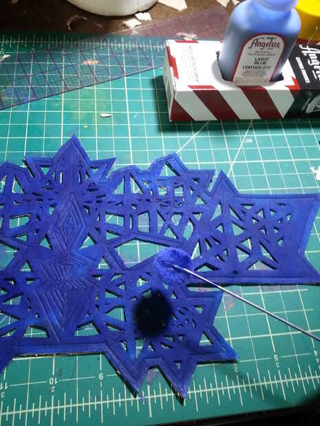 En el frente y atrás apliqué una capa uniforme de tinte azul en la máscara entera. He usado marca Angelus pero hay muchas otras buenas marcas que se puede utilizar.