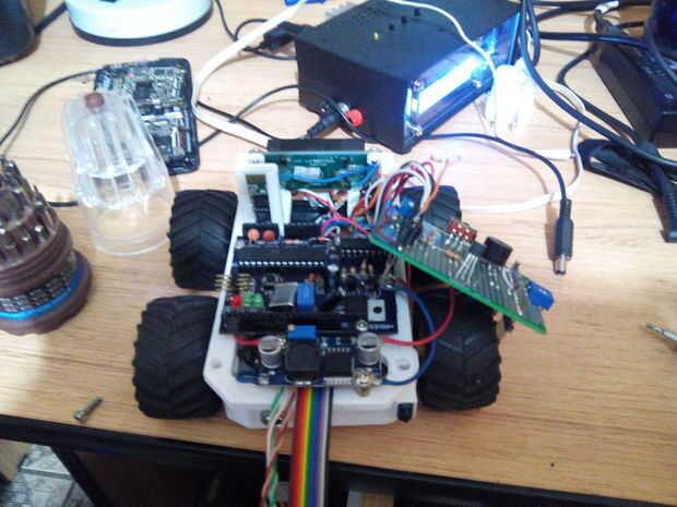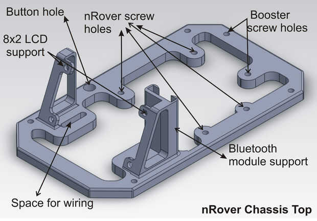 En la parte superior del chasis cuenta con el apoyo de la pantalla de LCD de 8 x 2, nRover Junta o placa Arduino, el convertidor elevador, espacio para el cableado y un agujero de un botón, además de los agujeros de fijación.