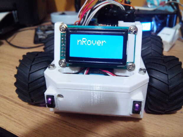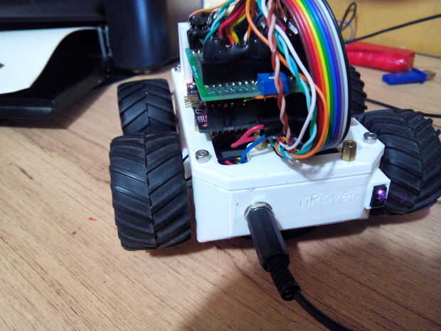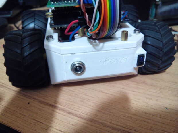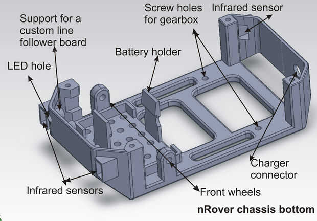 Hay un espacio para un led en la parte frontal del chasis y un soporte para un tablero de seguidor de línea personalizada, en la parte trasera, un espacio para un conector de alimentación.