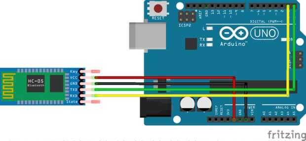El módulo Bluetooth es fácil de usar, simplemente conecte el VCC a la salida de 5V en el Arduino, GND a tierra, RX al pin TX del Arduino/nRover y viceversa.