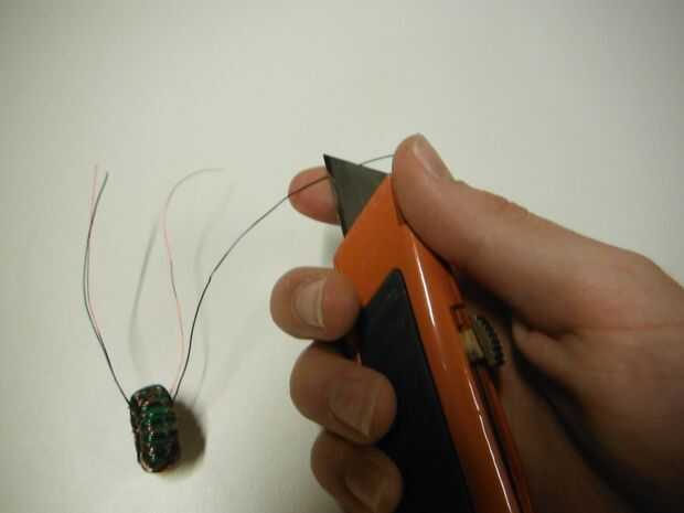 Tuerza sus dos tramos de alambre de Magneto al final. Enrolle el cable alrededor del toroide hasta cubrirlo en alambre. No importa que envuelve en la dirección. Una vez hecho esto, raspe el recubrimiento en el extremo del alambre de cada cable, ya sea con un cuchillo o una lija.