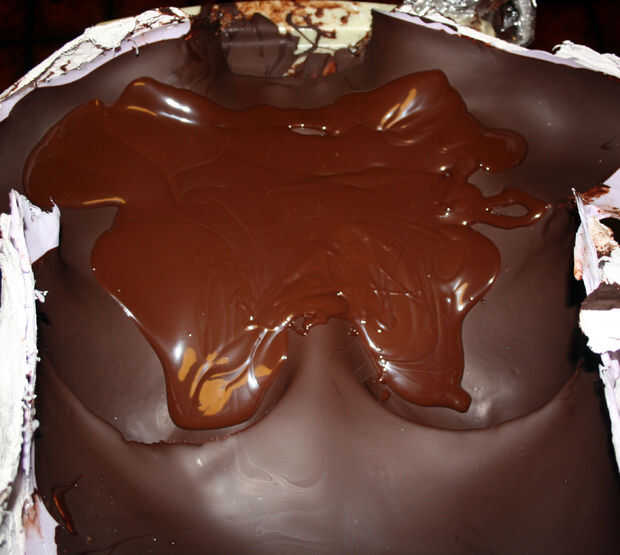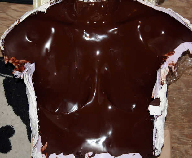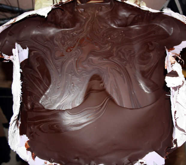 Con un cepillo de chip izquierdo fibras y trazos de pincel en el chocolate. Verter y dando vuelta el molde para asegurarse de que todo fue cubierto eran un mejor método.