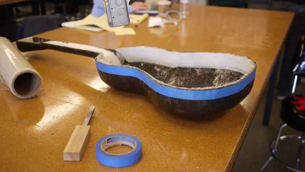 - Usando cinta pintores (u otro material contrastante) marca una línea hacia abajo desde el borde superior del cuerpo de la guitarra. El objetivo es hacer un labio más bajo donde puede sentarse la tapa armónica, permitiendo que las cuerdas ejecutar directamente de los trastes al puente.
