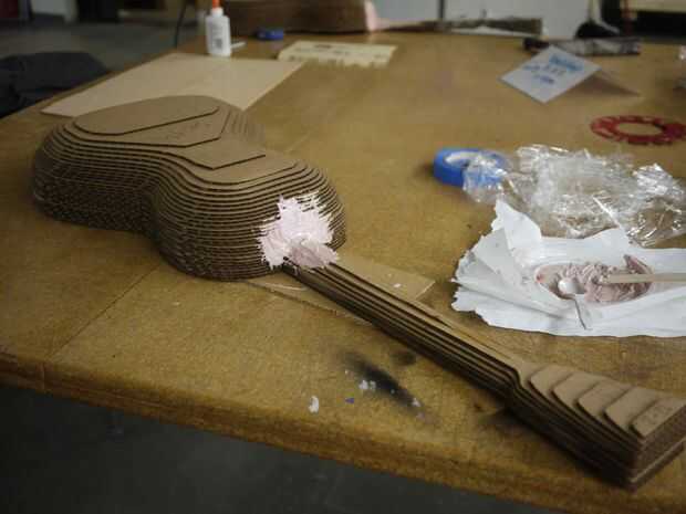 Clavó algunas piezas de madera de desecho hasta el fondo del molde (parte superior de la guitarra). La madera me dio una manija firme para el molde que podría poner en un vicio. El vice había elevado el molde y mantuvo constante de roca mientras trabajaba. También sugiero la mordaza de embalaje en plástico para mantenerla limpia.