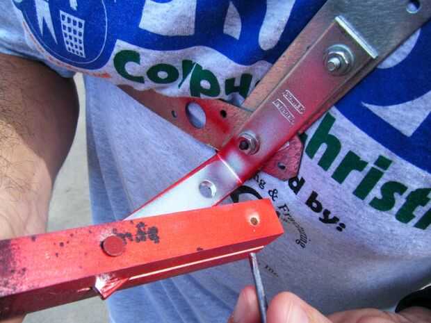 Una vez los cruciales primeros agujeros se perforan en los conectores de madera, puede utilizar tornillos y tuercas para unir todo. Aquí es donde los soportes L entran en juego. Apoyan la muestra sí mismo. Coloque el soporte en L como en la imagen y el taladro su segundo agujero donde sea necesario para mantener el soporte de balanceo de lado a lado en la primera tuerca y el perno. ¿Es necesario recordar para poner la tuerca en el exterior de la plataforma? No quieres frotar en su torso para la duración, aunque probablemente añadiría algo de sangre realista para el traje.