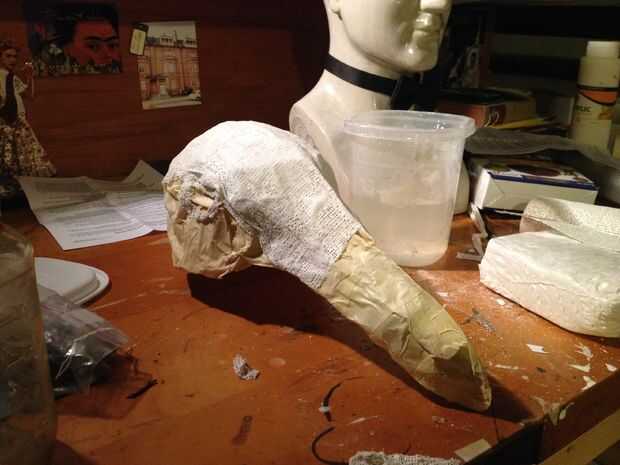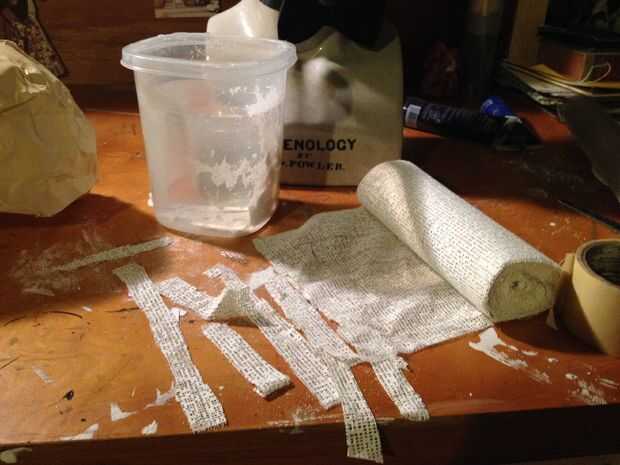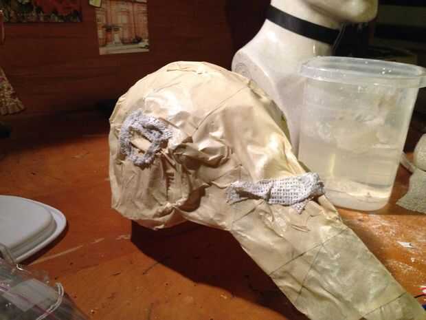 Recordar ese contenedor de agua le sobre?  Asegúrese de que está caliente!!!  Esto es una necesidad o de lo contrario no funcionará bien.  Cortar varias tiras de la tela de yeso de París y sumergir en el agua caliente.  Aplique el yeso en la parte superior de la zona de pico y también a los ojos.  Basado en esta pieza principal de una pintura que hice (que es cargado en mis fotos si quieres ver).  Los ojos eran el punto focal de la pintura y son bastante importantes.  Marcándolas ahora se facilitará encontrarlas más adelante.  Después de que se ha secado, tomar grandes tiras de la tela de yeso y aplicar a la figura entera.