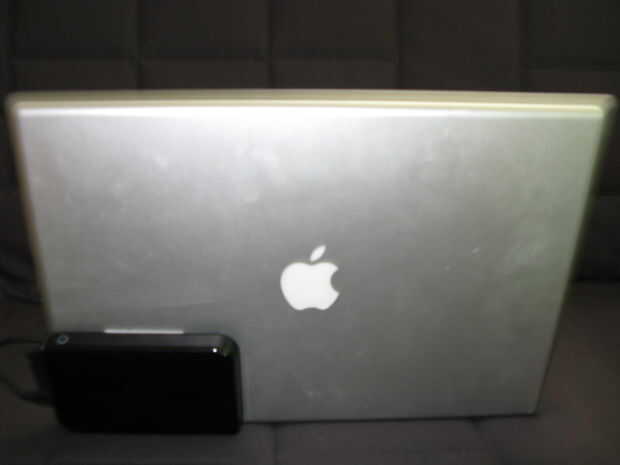 2. Agregue un velcro a la parte posterior de la unidad y luego a la parte posterior de su ordenador portátil. Ideal posición oblicua hacia el lado de la computadora que tiene los puertos USB/Firewire para que puedas usar el cable corto que viene con el disco.
