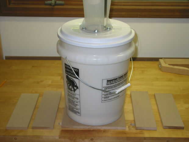 Si usas un Oneida polvo adjunto es importante tener en cuenta que el cubo es cónico - más pequeña en la parte inferior que en la parte superior. Por esta razón desea que la parte inferior de la caja para ser ligeramente más grande que la parte inferior de la cubeta. Con una caja de tamaño adecuado los lados basta con estar cerca de tres pulgadas de alto para proporcionar un buen ajuste y sostenga firmemente el cubo. Las fotos anteriores ilustran el proceso.