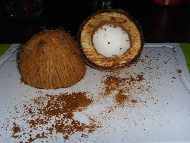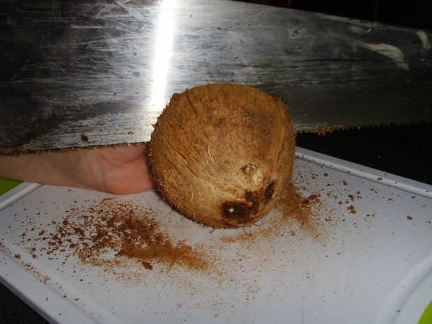 Vio el coco a su tamaño deseado. Si lo haces por la mitad, la puede hacer dos. ¿Cómo es para la economía? = P Si usted puede, sujetar el coco mientras que cortarlo, ' cos te hace la vida mucho más fácil y seguro.