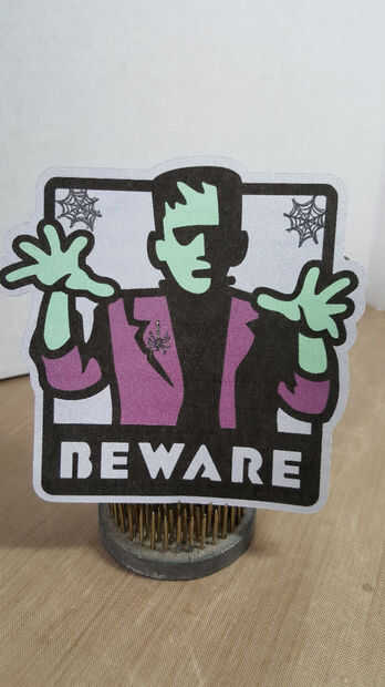 A continuación tomó la imagen principal e hizo una impresión y corte de imagen. Imprime esto y luego cortarlo, luego cortar la tarjeta base. Me adherí a la imagen de cuidado a mi tarjeta base con algunos puntos de espuma agregar cierta dimensión a la tarjeta. Para terminar la tarjeta agregué un pin de solapa pequeña araña a señor Frankenstein y luego trazó sobre él con mi bolígrafo negro Spica Atyou. También estampado algunas arañas pequeñas webs en cada esquina y remontado sobre algunas de las líneas otra vez con mi bolígrafo negro Spica Atyou.