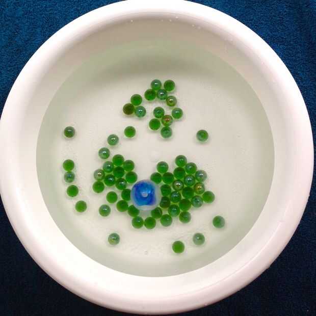 Bono: Tirar algunos mármoles y masaje los pies mientras girando alrededor. Acaba de poner el gran azul uno allí para los propósitos decorativos, pero es realmente grande para masajear el arco del pie. Sólo Coloque su pie en la parte superior, presionar ligeramente y ruédelo hacia adelante y hacia atrás. (Usted puede hacer lo mismo con una pelota de tenis en el piso cuando termine remojo).