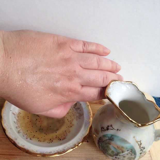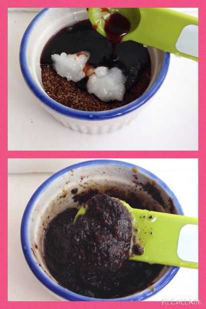 Cuando esté listo para usar, una pequeña cantidad de la mezcla seca (yo usé aproximadamente 1/8 de taza, que es bastante para dos usos) y añadir 1 cucharadita de aceite de coco y melaza. Aplique para mojar los pies, después de empapar o ducharse y frotar suavemente.