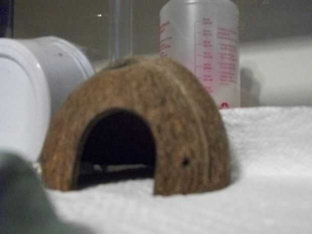 Geckos leopardo necesitan un mínimo de 3 cueros. Húmedo, uno en el lado caliente y uno en el lado fresco. Oculta puede ser cualquier cosa, desde pieles de reptil a caliente de cartón pegadas. Mis cueros caliente uso un tazón de agua de 2 en 1 y ocultar. Realmente uso un plato separado para el agua porque pensé que era demasiado profundo para mi gecko. Mi cool ocultará un medio coco con un agujero en el lado.