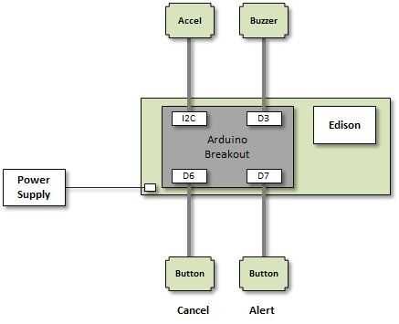 La configuración del sensor para la Edison es relativamente simple, requiriendo sólo tres pines GPIO para el timbre y dos interruptor de botones y un puerto I2C para el acelerómetro. Un pasador capaz de PWM para el timbre y está conectado a la D3 en la placa Arduino de breakout. D6 y D7 sirven para el interruptor de dos botones.