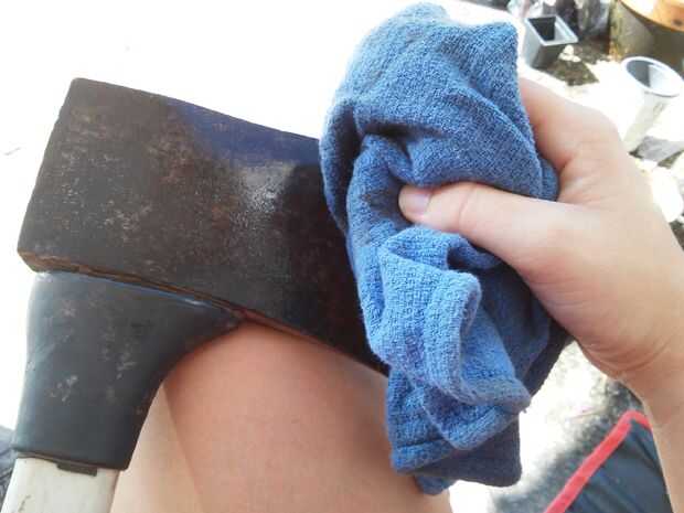 Después de que usted haya terminado de afilar su hacha, humedezca el trapo con un poco de aceite de motor y cubrir la cabeza de su hacha con él. El aceite de motor actúa como un disuasivo, algo muy importante en un ambiente húmedo.