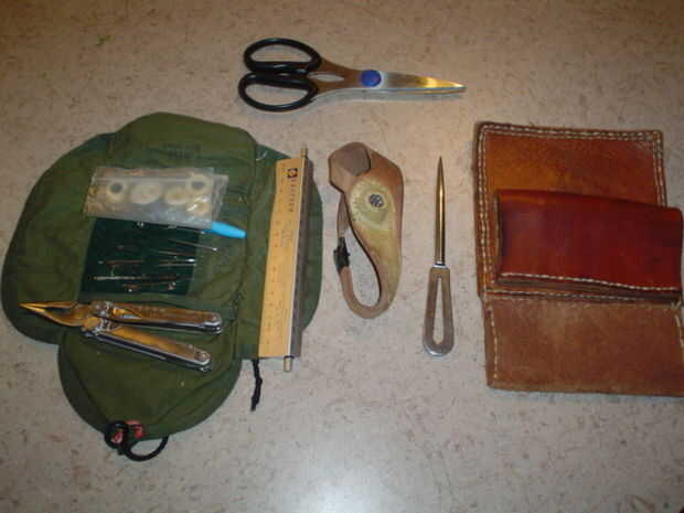 Tijeras de trabajo pesado; un carrete de hilo fuerte; Usé el kern interno desde el interior de una longitud de paracord; una aguja lo suficientemente grande como para manejar el paracord; un dispositivo de medición; velas Palma (un dispositivo utilizado por fabricantes de velas para empujar grandes agujas a través de la lona y el cuero); un alza de marlin para apretar los puntos de sutura o empujando los agujeros; una herramienta multiusos o pinzas; una correa resistente para colgar fuera de.