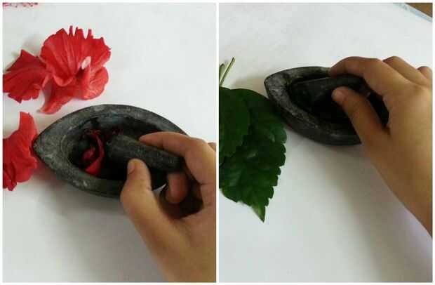 Machacar los pétalos de la flor de hibisco y hojas usando el mortero y maja,