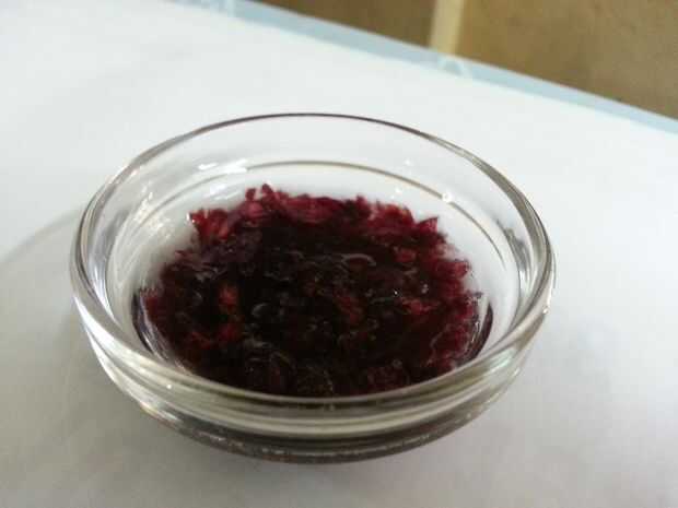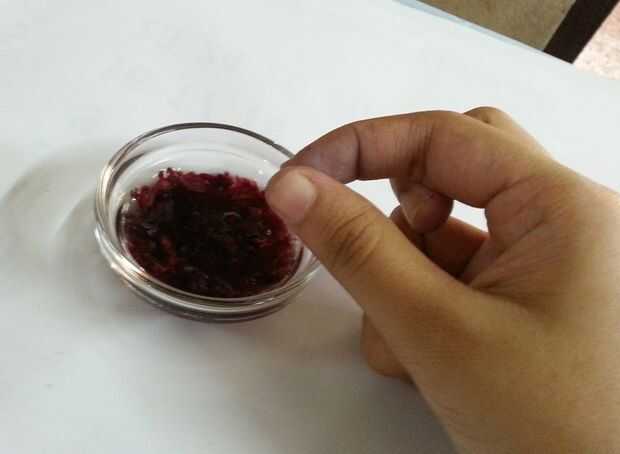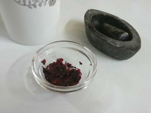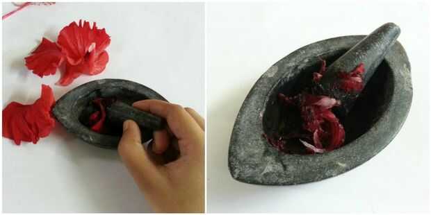 Aplastar o mezcla los pétalos de flor de hibisco,