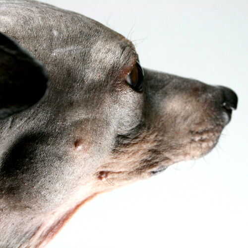 Momo es un miembro de la raza más sin pelo de perro.  Tiene bigotes y pelos microscópicos diminutos.  Tenía pelo cuando era pequeño, pero cayó hacia fuera después de unas semanas.