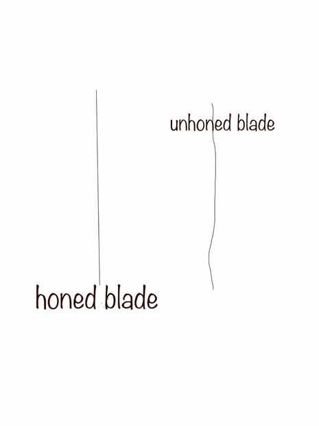 Este dibujo es una representación cruda... pero si nos fijamos en una hoja bien afilada con piedra será recto y fuerte. Uno que ha sido usado y lavado tendrá pequeñas imperfecciones a lo largo de la hoja. Estas imperfecciones pueden parecer pequeño pero pueden impedir que un cuchillo de corte en lo mejor.