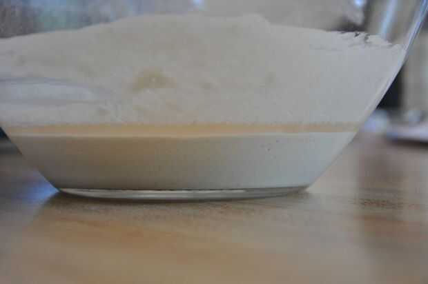 Día 1, la mezcla se separa con una fina capa amarilla de la formación de líquido en la parte superior. Un pequeño número de burbujas se empieza a formar mostrando que la levadura natural presente en la harina y la fruta están empezando a crecer.