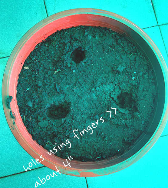 4. Ahora usando el dedo o un palo de madera, cavar 3 hoyos (tengo 3 plantas) de aproximadamente 4"- 5" dependiendo de la longitud de los esquejes.