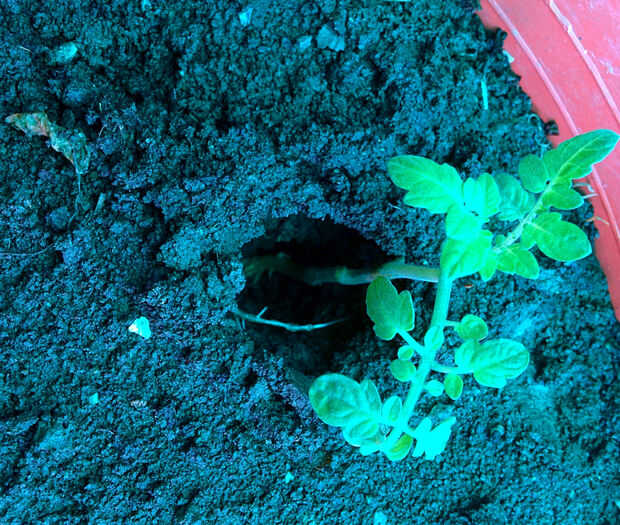 6. Mantener la planta con la uno mano y poner suelo en el agujero, seguir empujando el suelo suavemente.