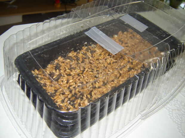 e) (opcional) para mantener el suelo húmedo durante las primeras etapas de crecimiento se puede utilizar el contenedor de plástico transparente como un invernadero. Quitar las etiquetas y asegúrese de que su suficientemente limpia para que de luz a través de. Usted puede necesitar cortar y cinta varios juntos, como para acomodar el tamaño de la bandeja de crecimiento. Así, puede utilizarse una bolsa de plástico transparente. Empujar los agujeros en él para proporcionar flujo de aire y coloque sobre la bandeja de crecimiento. También es útil en mantener gatos afuera porque quieren tener un pasto de trigo también.