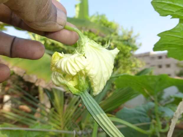 Calabazas tienen flores masculinas y femeninas separadas. La flor femenina con una fruta pequeña que se le atribuye tiene que ser polinizada para crecer en una fruta madura. Las abejas de la miel y algunos insectos ayudar a polinizar las flores. Sin embargo usted puede encontrar un montón de unpollinated flores femeninas jóvenes marchitan lejos. Es una buena práctica para siempre mano-polinizar cucurbitáceas (esto es posible solamente en el jardín de cocina a pequeña escala). Arrancar una flor masculina fresca y frotar sobre una flor femenina para transferir polen. También puede utilizar un cepillo suave para la polinización.