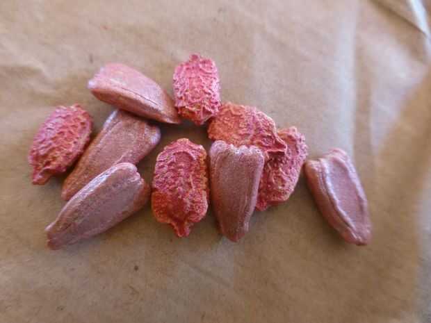 La tercera foto es de la semilla comprada. Estas semillas se tratan con pesticidas químicos y se colorean artificialmente para mostrar la presencia de plaguicidas. Tenga cuidado durante la manipulación de semillas tratadas químicamente, compradas y lávese bien las manos luego.