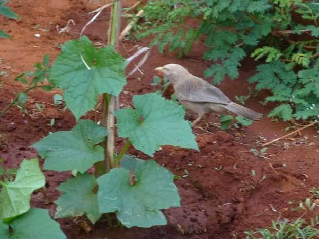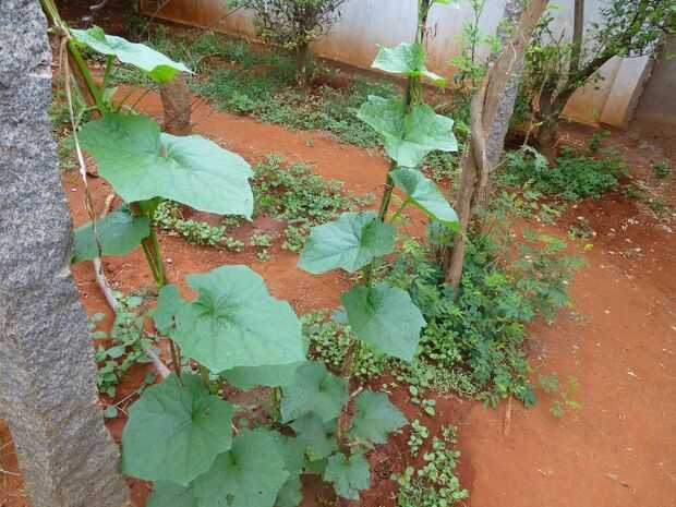 yo he trasplantado dos plantones en el hoyo preparado. Estas fotografías son de las plantas de semillero trasplantados después de 15 días. Usted necesitará proveer buen soporte a las plantas jóvenes hasta que alcanzan la altura de la rejilla.