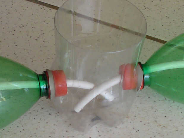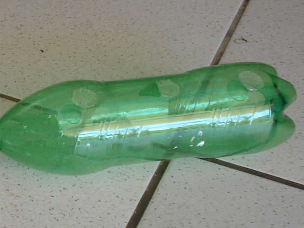 Hacer tres agujeros distribuidos en una línea en el lado de las otras dos botellas.
