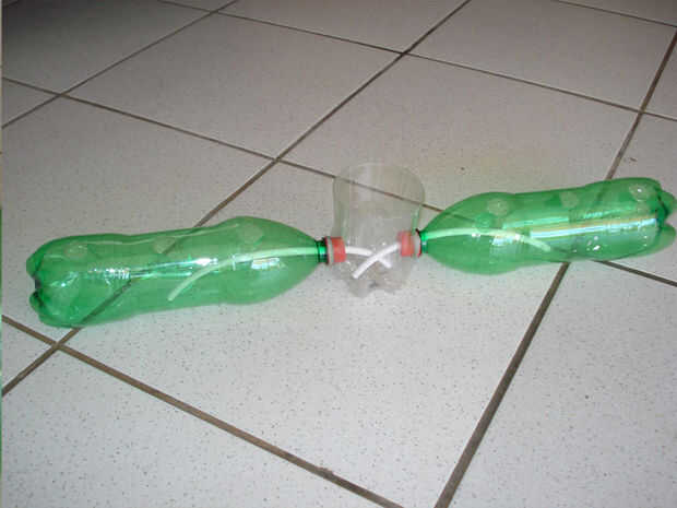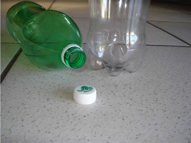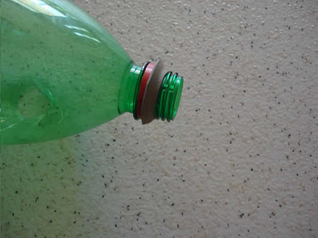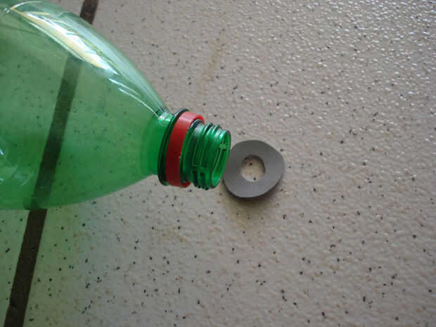 Corte a dos arandelas de goma con el orificio central de unos 20 mm. lugar las arandelas en la boquilla de la botella.