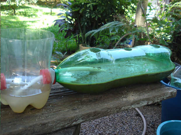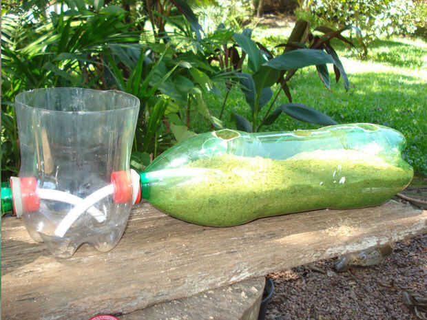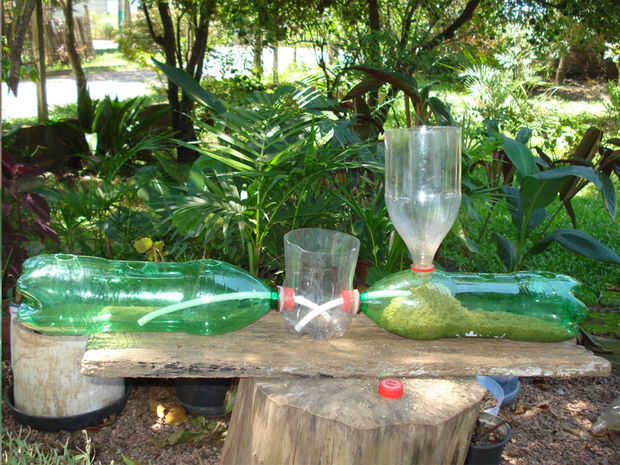 Lleno de arena hasta la mitad mentira dos botellas, utilizando el resto de la corte-botella como embudo. Es más fácil si la arena está muy seca. Finalmente completa la nave central de agua y esperar hasta que se alcance el nivel de la arena. Las trampas se deben llenar con agua.