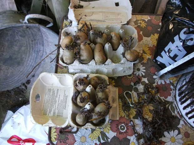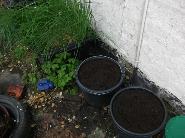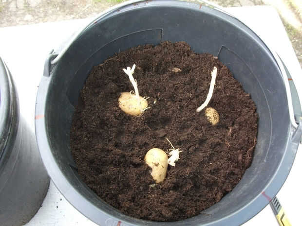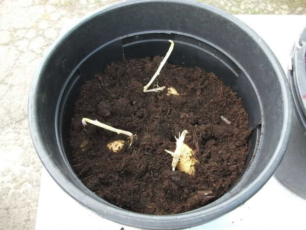 Antes de los cubos empecé a brotar las papas. Primero colocar la cubeta interior en el cubo exterior. Luego llenar los cubos la mitad con el suelo. Ahora colocar una patata justo enfrente de cada ventana de mitad del camino desde el centro al lado del cubo. Entonces puedo llenar los cubos con suelo, teniendo buen cuidado los frágiles brotes. Finalmente doy las papas una buena cantidad de agua. El suelo embalar alrededor de las patatas, así que puede ser necesario añadir más tierra. Recuerde, papas no deben obtener ningún tipo de luz, se vuelve verdes y se convierten en venenosos (producir solanina). Colocar los cubos en un punto de luz, pero evitar la luz directa del sol. Dar las papas en suficiente agua pero no dejes a remojo.