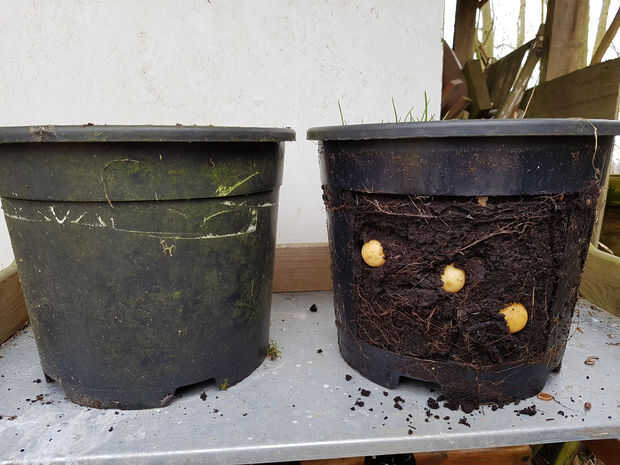 Cuando la planta de papa empiezan a florecer la primera cosecha está listo. Quite el cubo interior de la cubeta exterior y tomar la cantidad de patatas que desee. El suelo que cae fuera de la cubeta de repuesto. Cuando termine, coloque la cubeta interior en el cubo externo y poner el suelo nuevo encima de la superficie donde tomaste las patatas. El suelo se vuelva por el resto de las patatas. Puede ser necesario añadir más suelo, evitando la luz solar a las patatas.