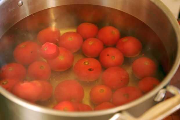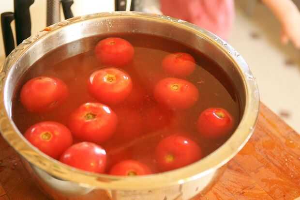 Después de unos minutos retirar los tomates del agua fría y colocar en un recipiente en nuestra área de trabajo. Ahora están listos para ser pelados y quitado el corazón. Si tienes un ayudante puede iniciar el siguiente paso mientras sigue escaldado y enfriamiento el siguiente lote.