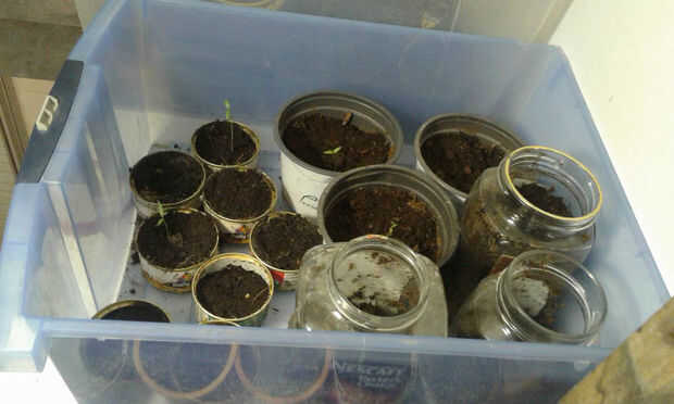 Tengo un patio que no recibe suficiente luz solar para el cultivo de verduras, por lo que estoy creciendo mi jardín en mi valla en contenedores. Muchos de los envases que estoy usando ya sea reciclar o encontrados. También he plantado varias de mis plantas de esquejes, desechos de cocina o semillas que obtuve de alimentos.