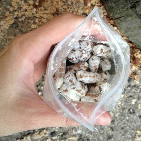 Ordené mi reaparición de Hongos Perfecti. Vienen como tapones de madera cubiertos de material pegajoso blanco, cuidadosamente sellada en plástico. Tengo varias variedades (shiitake, ostra, pero también melena de León y el pollo de las maderas). Sólo quieren poner un tipo de seta en cada registro para que no tengan que competir entre sí.