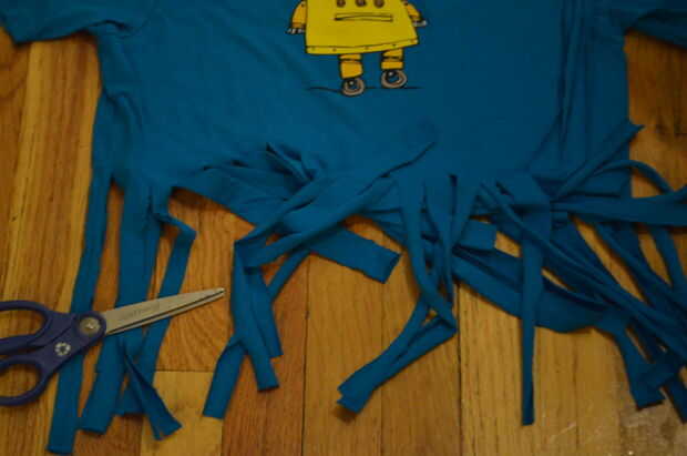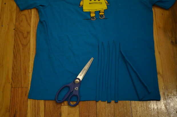 Usando un par de tijeras de tela fuerte 1/4 de pulgada de corte tiras de tela a partir de la parte inferior de la camisa. Cortar las tiras de la misma longitud, lindan 4-6 pulgadas hacia el centro de la camisa, dependiendo de cómo corto quieres tu top de cultivo que. Franjas de corte todo el camino alrededor de la camisa hasta que usted ha hecho todo a perder alrededor de la camisa.