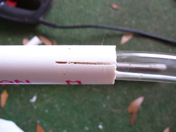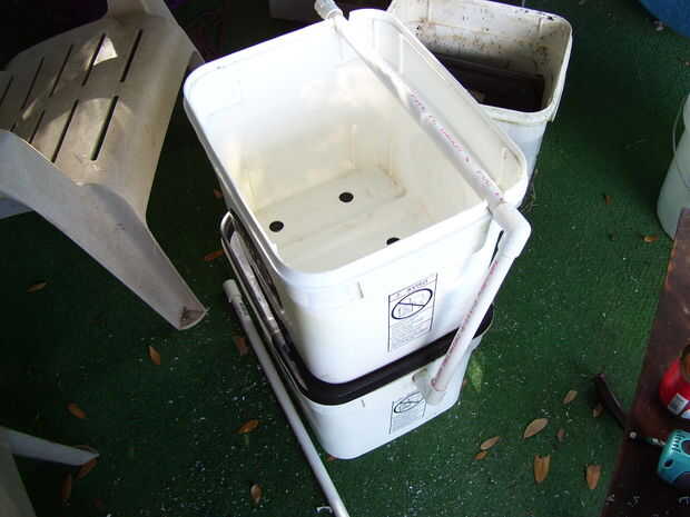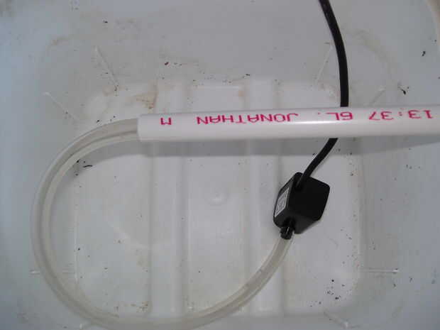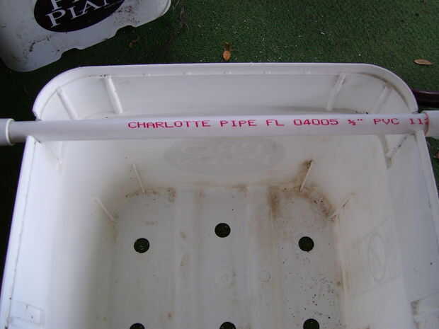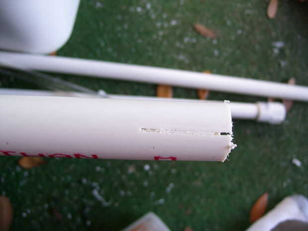 Ahora perfore un montón de agujeros de 1/8 de pulgada en el tubo en la cubeta superior para crear la barra pulverizadora. Divide el extremo va en el cubo de abajo con una sierra alrededor de 1,5 pulgadas.
