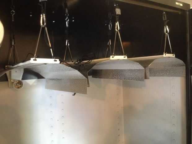 Utilicé 3 200 W fluorescente crece luces en mi gabinete. Usted puede utilizar bombillas de menos si se desea de la misma potencia o más vatios por bombilla. Hable con su hidroponía local profesional para determinar el mejor conjunto sus necesidades. Medir entre los ganchos de la lámpara y del gancho en el borde del accesorio. Determinar las dimensiones para el montaje de luces en el centro del gabinete. Perforaciones para coincidir con sus pernos de ojo, y luego montar los pernos. Colgar las tarjetas verticales de luz de estos tornillos y luego colgar las luces de las tarjetas verticales de luz. Ahora eres capaz de subir y bajar su luz según sea necesario. Su profesional local ayudará con estas bandas.