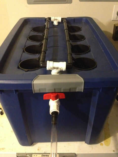 Bolsas plástico son fácilmente disponibles. Sólo necesita decidir sobre el tamaño que se necesita para su sistema. Mina tiene espacio suficiente para 8 ollas de tres pulgadas. Taladro de los agujeros del tamaño adecuado para las ollas que está utilizando y uniformemente espaciados. Centro de una lengüeta de la manguera de 3 vías en cada maceta y conéctelos a los lados de la bolsa usando tubería de flex. Con una lengüeta de la manguera de 90 grados con rosca en un extremo, Conecte cada extremo a un conector de pvc de 3 vías tal como se muestra en la foto. En la parte inferior de uno de los conectores de pvc es una lengüeta de la manguera para conectar a la bomba del estanque. El otro lado tiene una válvula para drenar el agua. Exactamente qué piezas necesita depende de la configuración particular que usted está usando. Colocar piedras de aire y la bomba en la parte inferior. Conexión 1/4" tubería a piedras de aire y funcionamiento tubo de bolsa bomba de aire. Conecte la tubería de la bomba a la lengüeta de la manguera en la parte superior de la tapa de 1/2". Conecte el termopar y pH electrodo al lado y dentro de la bolsa para que se sientan en el agua.