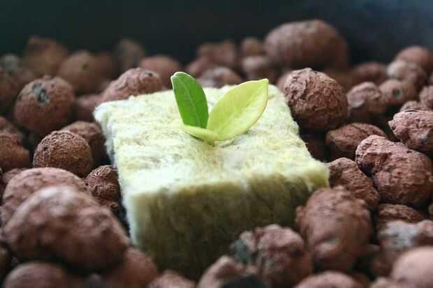 Llene las macetas con hydrokorrels y coloque los cubitos de lana de roca previamente propagados.